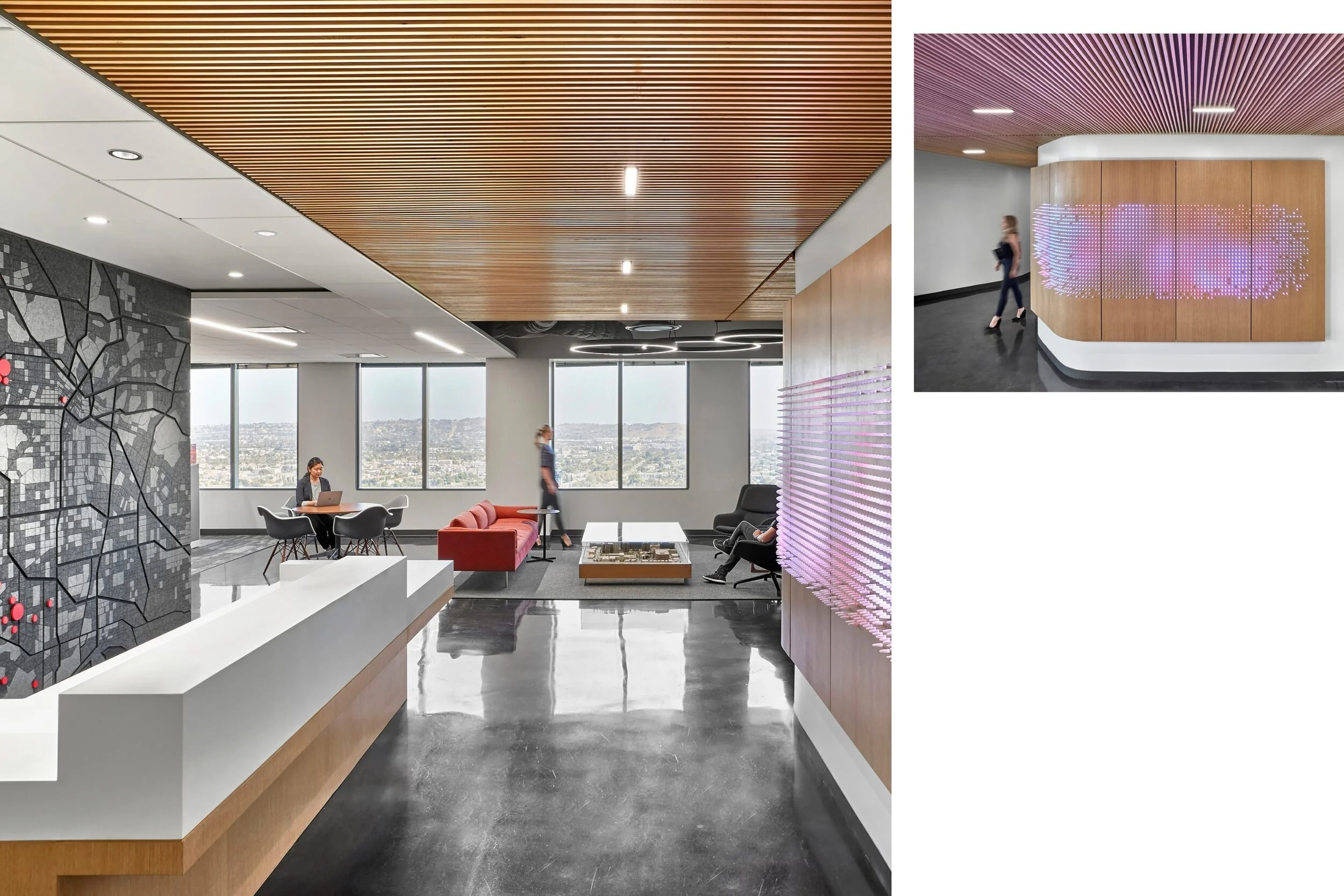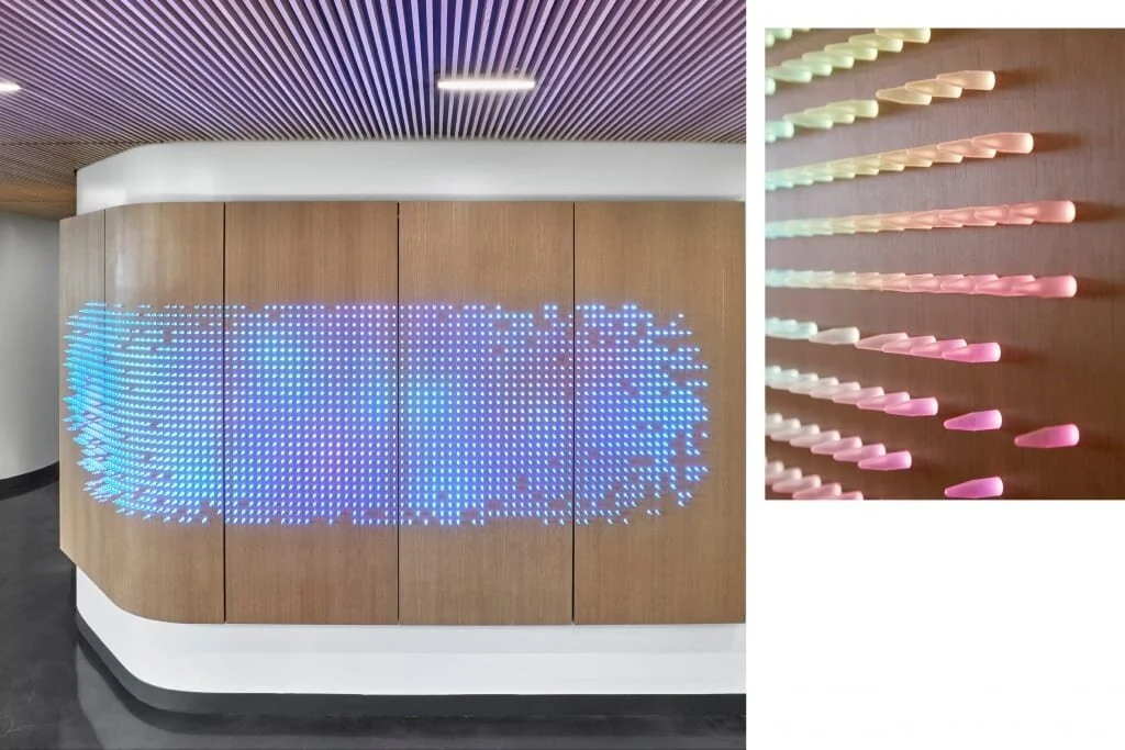 Lighting Installation at Cedars-Sinai, 6500 Wilshire Boulevard, 20th Floor, FPDC Relocation Los Angeles, CA. Across from the reception wall is a 14-foot-wide by nine-foot-high art installation that consists of 2,500 medical-grade centrifuge tubes protruding from perforated wood panels and backlit by 3,500 color-changing LED lights that animate to represent the city lights. Programmed to an algorithm based on harmonic resonance, the ever-evolving artwork never displays the same color combination twice in 24 hours.